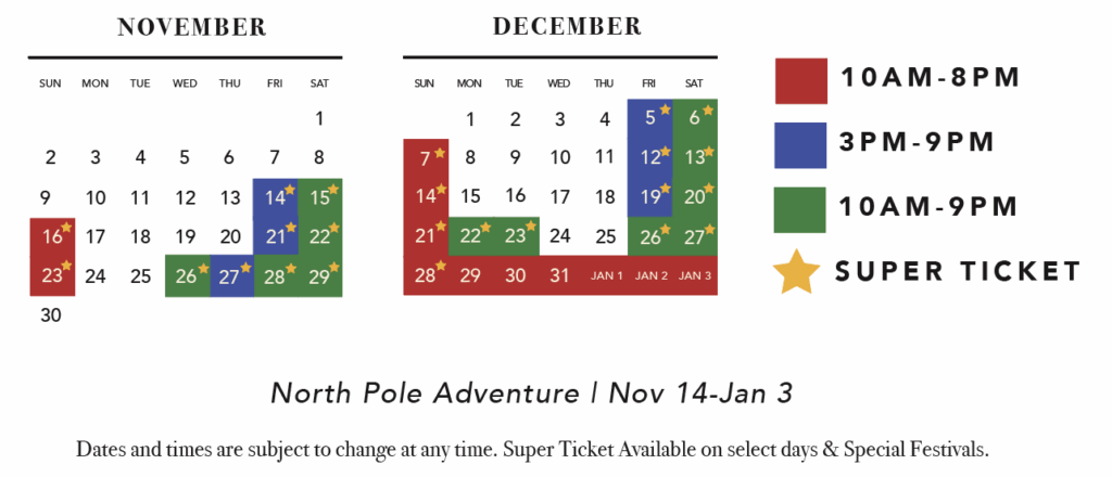 NOTE: All guests entering North Pole Adventure are required to complete a waiver online with the purchase of tickets OR upon arrival when purchasing at the ticket booth.